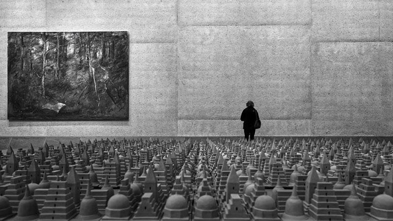 The lady seems to be staring at the blank concrete wall; but she was actually reading the information plaque relating to the repetitious miniature city sculpture on the floor behind her.
