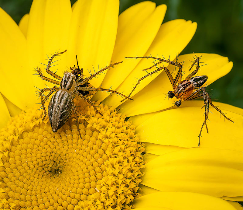 The composition is immaculate, and the timing of the interaction between the two lynx spiders is delightful. Every detail is tack-sharp and the creamy yellow of the daisy is exquisite. (I particularly like the flower’s textbook example of a Fibonacci spiral).
