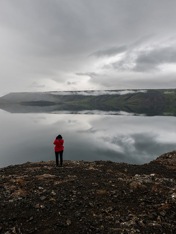 While on a cruise from Copenhagen to New York, one of our stopovers was at Reykjavik, Iceland, where I managed spend the day on a photo tour with a bunch of other photo nuts from the cruise. Our guide was Mike Kissane of fStop Tours and one of our photo stops was at Kleifarvatn Lake about 40 or so minutes out of Reykjavik. It was a great day out where I spent most of the time talking to Mike and taking very few photos. This one was of one of the other tour participants taking her own photos of the very calm lake with the red rain jacket a bit of a standout.