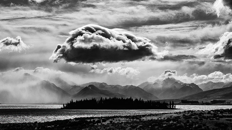 First, there is that extraordinary cloud, seemingly hovering over the inky black forest of the island, then there is the windblown surface of the lake, looking like a sheet of hammered silver, and finally there are the jagged, cloud-wreathed peaks which are putting on their own show.