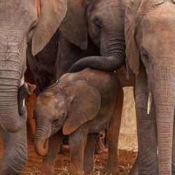 Mother and aunties surround the baby for shade and protection. They all want to be able to current and cuddle the new member of the herd. They area all covered with dust from a nearby bright orange termite mound.