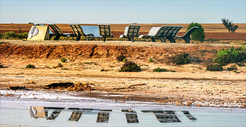 The ‘Sky Lounge’ circle of metal recliners beside the lake, which invites visitors to relax and watch the night sky. Note the reflections in the water in the foreground.