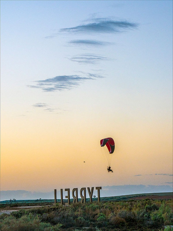 Just before sunrise, a paramotorist enjoying the view over the Lake Tyrrell sign at the edge of the lake.