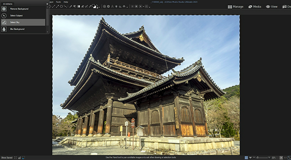 4. AI Actions provide one-click tools for performing complicated procedures like removing or blurring the background, selecting the subject or the sky, or giving your subject a black and white background. AI-based sky replacement is not provided.