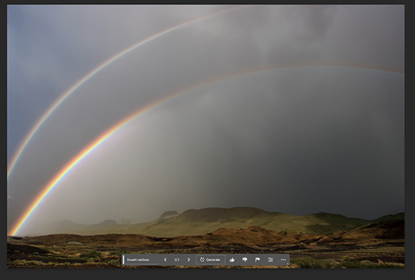When we asked Photoshop to insert a rainbow into a selected area of sky in this outback landscape shot, the Generative Fill tool went well beyond the boundaries of the original selection. Judge for yourself whether you like any of the three options offered.