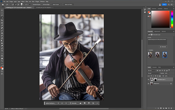 Changing a background. Generative Fill processing did a really good job when we asked it to replace the background in the image below with the interior of a pub.