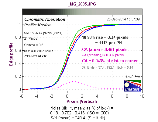 With both cameras, our Imatest results ranged between the upper levels of the ‘negligible’ band to the lower third of the ‘low’ band. In the graphs of our test results below, the red line separates the negligible and low bands, while the green line marks the edge of the moderate band.