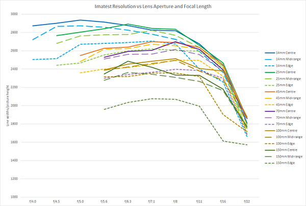 Like most high-ratio zoom lenses, the performance of the M.Zuiko Digital 14-150mm f/4.0-5.6 II lens varies across the zoom range. We measured the highest resolution at the 14mm focal length with an aperture of f/5 but it declined progressively as the focal length was increased, as shown in the graph of our Imatest result below.