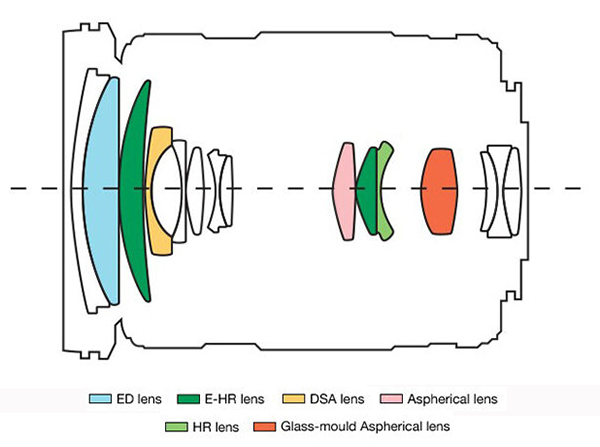 Lens construction: 15 elements in 11 groups (including 3 aspherical elements of which one is ED glass plus 2 ED elements) plus ZERO  (Zuiko Extra-low Reflection Optical) multilayer coating