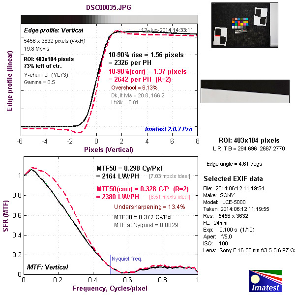 Imatest showed the performance of this lens to be somewhat mixed. At the optimal focal length and aperture settings (24mm at f/5) it was just able to meet expectations for the 20-megapixel sensor on the α5000 camera we used for our tests.