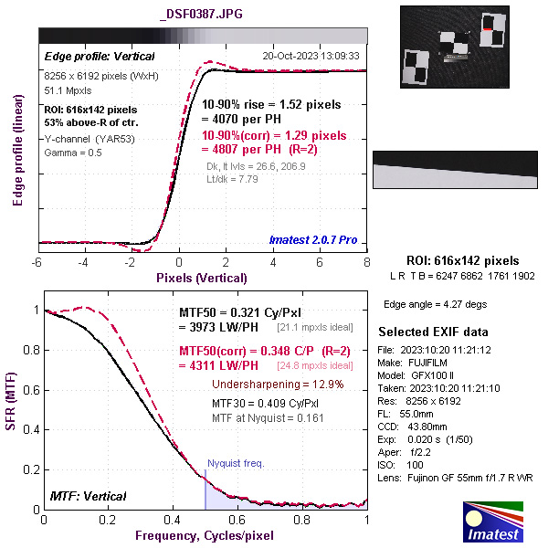 We tested this lens on the GFX 100 II camera but had to work with Medium/Super fine JPEGs and reduce the size of the RAF.RAW files to match them because our Imatest software can’t handle 100-megapixel files. This should have little or no influence on our overall assessments.