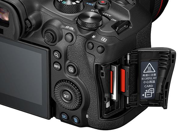 This illustration shows the new media slots arrangement in the EOS R6 III. (Source: Canon.)