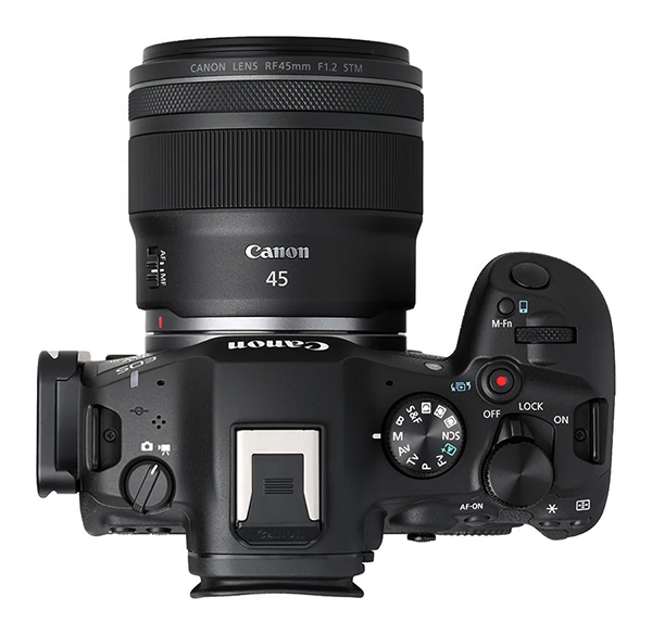 Top view of the camera fitted with the RF 45mm f/1.2 STM lens. (Source: Canon.)