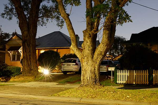 ISO 6400, 4-second exposure at f/8. Note the starburst caused by a light turning on during the exposure.
