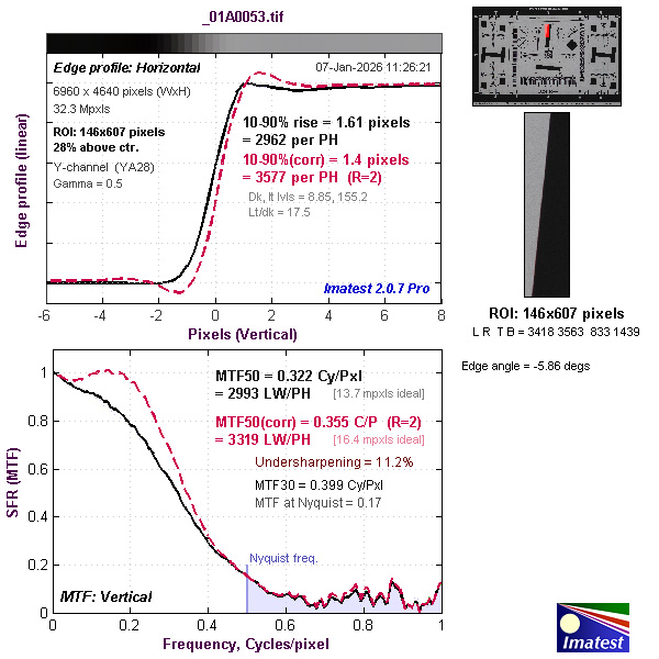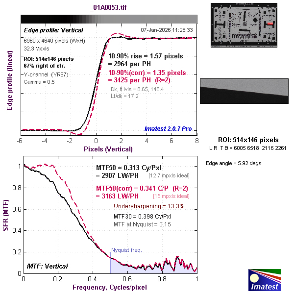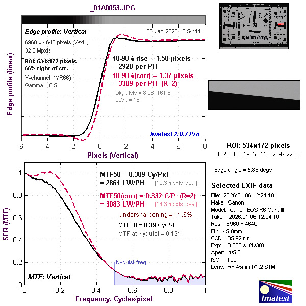Our Imatest evaluations, which were made with the RF 45mm f/1.2 STM lens, which is not an ideal match since it’s been designed for entry-level full-frame cameras. Fortunately, however, we were able to find some optimal settings where resolution came close to – or in the case of CR3.RAW files, just above – expectations for the camera’s 32.3-megapixel sensor.