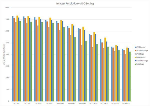 In our tests of the camera’s ISO range, resolution remained relatively high from ISO 100 through to ISO 1600 before tailing off at sensitivity was increased, as the graph of our test results, above, shows. Interestingly, the differences between JPEG and CR3.RAW files (which were converted into 16-bit JPEGs with Adobe Camera Raw, our preferred raw file converter), were relatively small, suggesting in-camera file processing can deliver very good results.