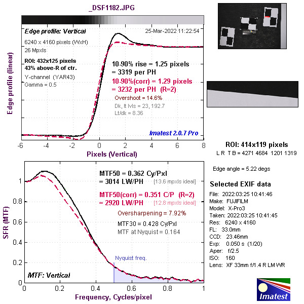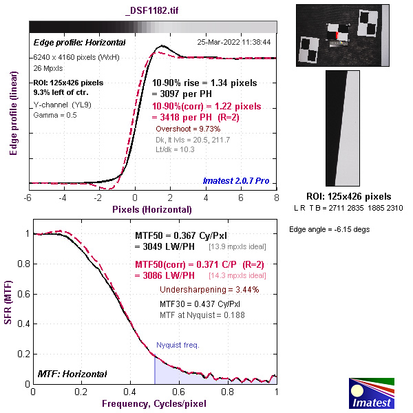 As usual, assessments of vignetting and rectilinear distortion were made with RAF.RAW files, even though similar results were obtained from JPEGs taken at the same time with all in-camera corrections disabled. Interestingly, because Adobe Camera Raw applies the built-in profile corrections (and you can’t disable them), we had to use an alternative viewer to check both aberrations.