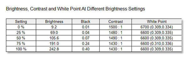 The contrast ratio results were relatively consistent, with both the white point readings and the black point readings tracking slowly upwards, as expected for the increase in screen brightness settings.