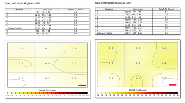 Colour uniformity measurements showed no signs of a ‘hot spot’ at either 50% or 100% brightness. This is an excellent result and reflected in the ‘perfect’ score in the overall monitor rating.