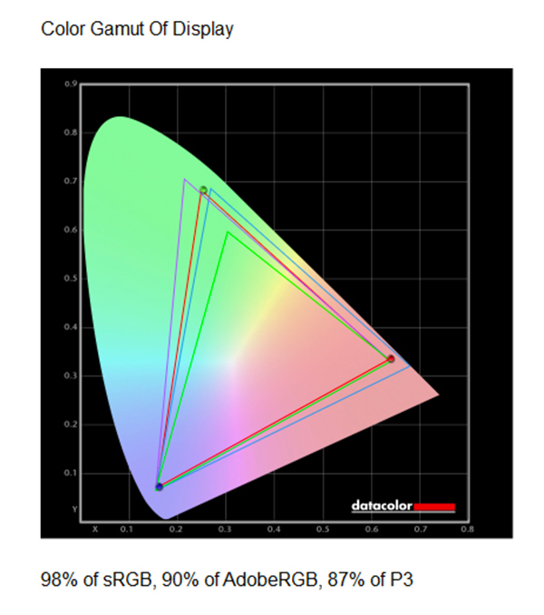 Wide gamut coverage: 99% DCI-P3, 100% sRGB, 97% Adobe RGB, with 10-bit color depth