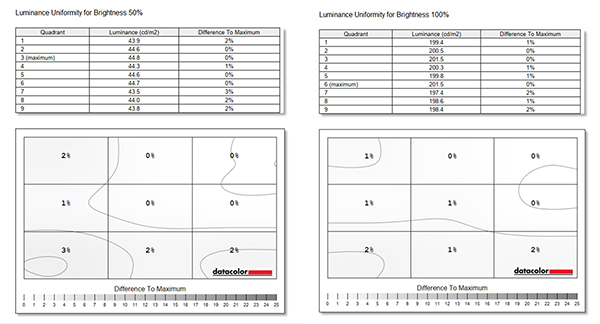 Both luminance uniformity readings showed relatively even brightness levels all over the screen, with only a 2% maximum deviation at 100% brightness and 3% at 50% brightness. This is shown as a good score on the overall monitor rating.