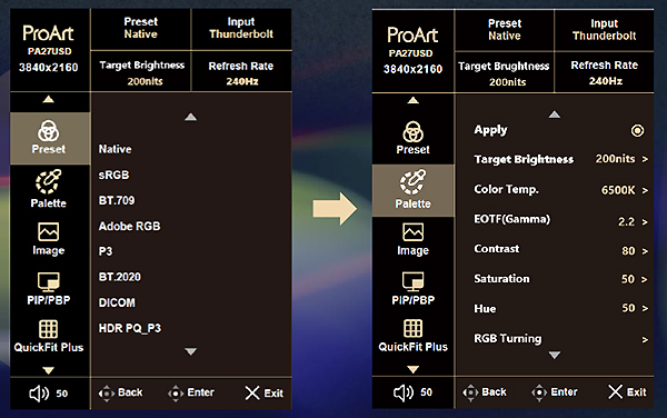 The new on-screen display (shown above) provides quick views of current screen settings, making it easy to select display modes and make necessary adjustments. The ProArt presets cover all the main colour spaces used for photography, printing, web design, digital cinema, 4K content development for broadcast and games, satellite TV and movie productsion.