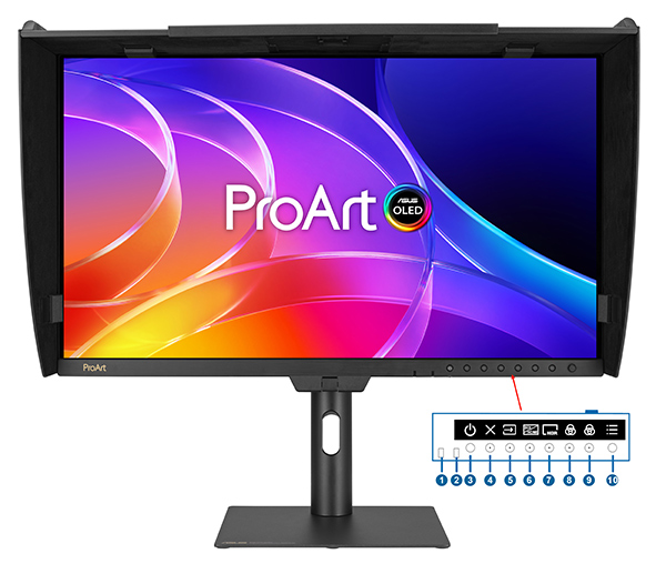 The line of buttons on the lower bezel starts with the proximity and ambient light sensors (1 & 2) then provides shortcuts to the power on/off (3) plus the following functions: exit (4), input select (5), SDI/HDMI (6), HDR (7), two shortcut buttons (8 & 9) and the menu (5-way) (10). The shortcut buttons are programmable but default to energy saving and brightness adjustment hot keys. Pressing any button (except the power button) accesses the OSD menu. Self-Calibration can be triggered by monitor OSD and ProArt Calibration Software.