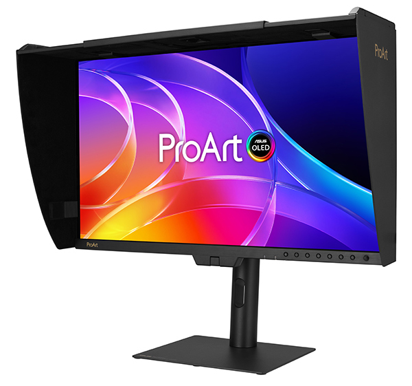 Angled view of the ASUS ProArt Display PA27USD on the supplied stand with the bundled shading hood installed. (Source: ASUS.)