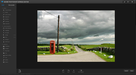 Photoshop Express is a free basic editing and image organisation app for smartphones and tablet PCs. Available for both iPad and Android devices, it provides a ‘quick fix’ tool set for cropping, straightening, adjusting exposures and colours and touching up minor imperfections plus a range of digital effects. The adjustments provided are limited but they should be adequate for casual users of the devices.