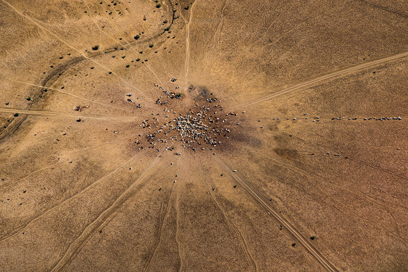 Aerial, cattle at drinking trough near Julia Creek, western Queenland.