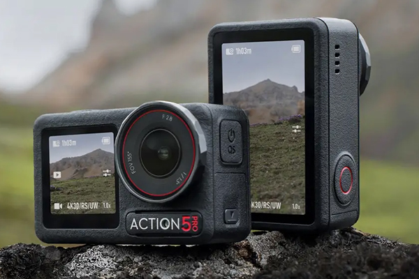 There are two OLED touch displays: the front screen a 1.46-inch display with 342 x 342 resolution and the rear screen a 2.5-inch 400 x 712-pixel display with 800 cd/m2 maximum brightness (typical). The camera is waterproof to 20 metres or 60 metres with a waterproof case. A built-in Pressure Gauge displays water depth and altitude and the camera automatically starts/stops recording when entering/exiting water. It has three built-in microphones and a class-leading 4-hour battery life. There is 64 GB of built-in storage, with 47 GB available for use plus extensions available through a MicroSD media slot. Wi-Fi 6.0, Bluetooth 5.1 and USB 3.0 connectivity are provided with wireless transfer speeds up to 80 MB/s and support for live streaming and recording