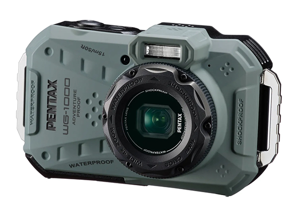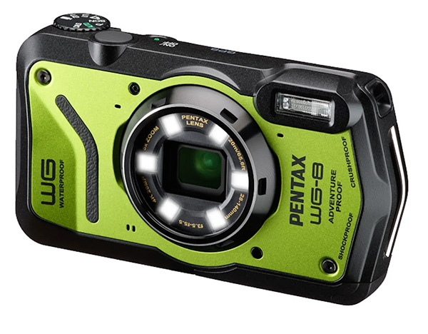 Pentax’s flagship WG-8 camera is waterproof to 20 metres and can be used underwater for up to two hours. It has a 20-megapixel 1/2.3-inch (6.17 x 4.55 mm) BSI-CMOS sensor and fixed, 28–140 mm (equivalent) f/3.5-5.5 lens. However, it lacks a viewfinder and can only record images as JPEGs. The only stabilisation available is Digital Shake Reduction. The camera is offered in green or black and its toughened body is dust-, crush-, freeze- and shock-proof to 2.1 metres. It comes with a 6-LED ring light surrounding the lens plus built-in GPS and a digital compass.