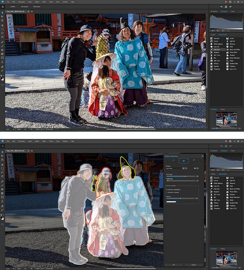 These two screen grabs illustrate the difficulties many AI selection tools have when trying to identify the subject of the shot. Too often they fail to pick up key parts of the subject (outlined in yellow in the lower screen grab) or select unwanted areas (outlined in red). If you can’t adjust the AI selections, the tool is of little value.