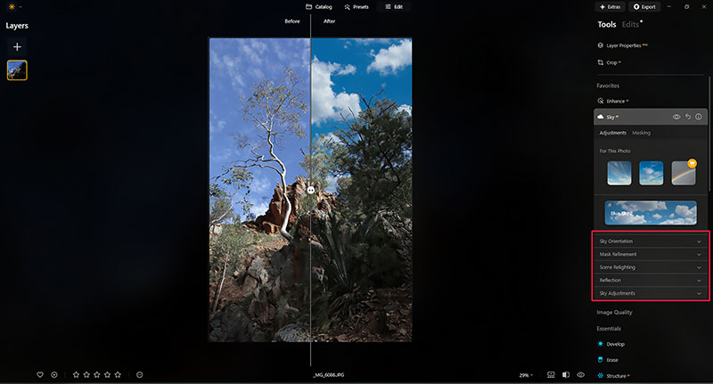 Sky replacement is one of the better-developed AI-based tools, particularly when the developer provides adjustments for positioning the sky with respect to the main subject and feathering or fading the edges of the selection. You should also be able to adjust the brightness, contrast and saturation of the ‘new’ sky to make it integrate more naturally with the scene.