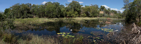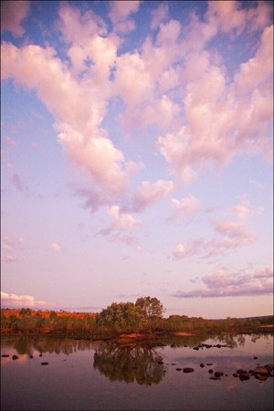 We spent most of Day 6 on the road, travelling from the Ungolan Wilderness Lodge to our next stopping place, the El Questro Emma Gorge Resort. This involved back-tracking more than 200 km to the Gibb River Road and fording the Durack and Pentecost Rivers, both of which were still running, although passable in a suitable vehicle. ![]() Looking east towards the Cockburn Ranges, which provide a background to the huge El Questro Cattle station, which today is largely devoted to tourism. (Canon EOS 5D Mark II with EF 24-105mm f/4L IS USM lens; ISO 400, 55mm focal length, 1/50 second at f/8.) ![]() A quiet section of the Pentecost River, with riverbank trees and evening clouds reflected in the calm water. (Canon EOS 5D Mark II with EF 24-105mm f/4L IS USM lens; ISO 800, 24mm focal length, 1/30 second at f/5.6.) We arrived at Emma Gorge well after dark; too late for any photography. Our accommodation consisted of very up-market ‘safari’ style tents with Queen-sized beds and en-suite bathrooms. A slight upgrade on the accommodation at Ungolan – but not very much.