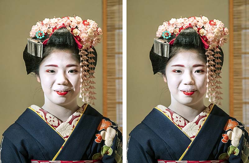 Indoor lighting over which you have little or no control can cast unattractive shadows across a subject’s face, as shown in the left side picture in this pair. If you can’t alter the lighting, you can cut back unattractive shadows by editing the photograph post-capture, as shown in the picture on the right.